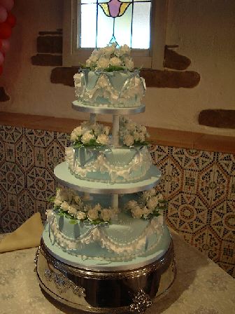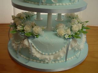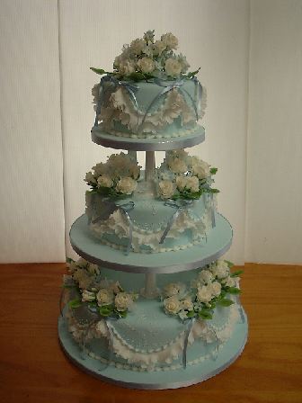 白いバラが映えるように土台のケーキは水色に決め、サイドデコレーションは白いフリルをあしらって、