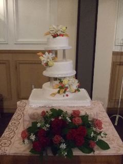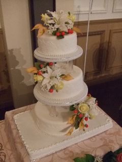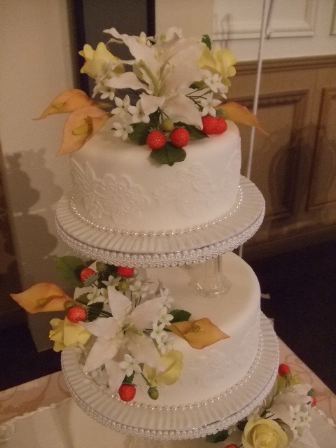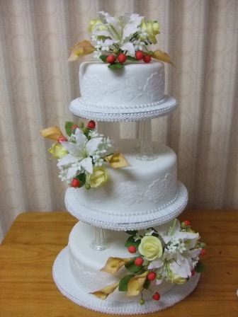 清楚な白い3段のウエディングケーキに、大きな白百合とオレンジ色のカラー、黄色のバラ、